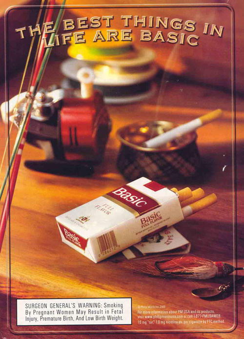 Ad for Basic cigarettes, featuring an image of the pack on a table next to a fishing rod. "The Best Things in Life are Basic".