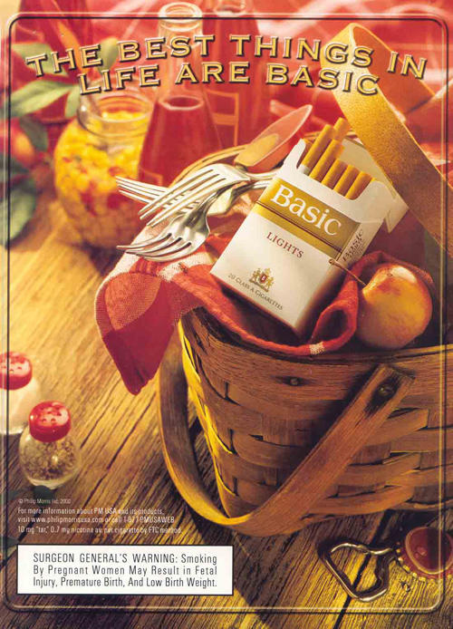Ad for Basic cigarettes, featuring an image of the pack inside of a picnic basket. "The Best Things in Life are Basic".