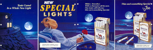 Ad for Camel Special Lights, featuring an image of Joe Camel smoking and holding a rose. "This one's something special"