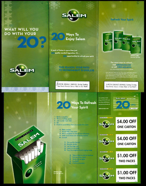 Direct mail from Salem, using a new "Refresh Your Spirit" slogan. The piece highlights "20 Ways to Enjoy Salem" and "20 ways to refresh your spirit". Piece has a winter theme (as noted by snowflake designs) and was received around December 2005. Also includes a bonus card for 20 free UPCs, an entry form for a friend to sign up, and 4 coupons (2 $4.00 off a carton coupons, and 2 $1.00 off of two packs coupons).