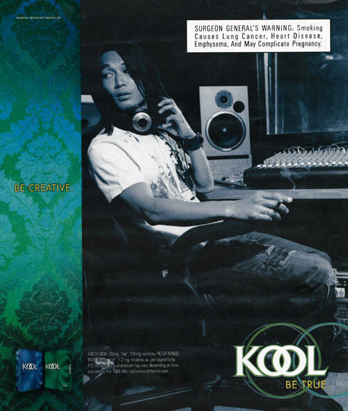 KOOL ad in promotion of the "Be True" campaign. The ad features an image of an Asian man smoking a cigarette and while sitting in a music studio. Text:"Be Creative"