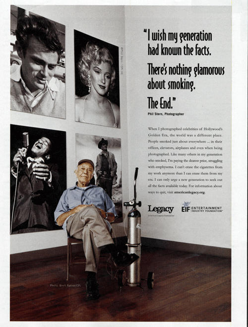 Anti-tobacco ad sponsored by the American Legacy Foundation and the Entertainment Industry Foundation, featuring Phil Stern, a known Hollywood photographer. Text: "I wish my generation had known the facts. There's nothing glamorous about smoking. The End." "When I photographed celebrities of Hollywood's Golden Era, the world was a different place. People smoked just about everywhere...in their offices, elevators, airplanes and even when being photographed. Like many others in my generation who smoked, I'm paying the dearest price, struggling with emphysema. I can't erase the cigarettes from my work anymore than I can erase them from my era. I can only urge a new generation to seek out all the facts available today. For more information about ways to quit, visit americanlegacy.org"