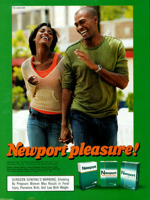 Ad for Newport cigarettes featuring an image of an African American couple holding hands, laughing and walking outside.