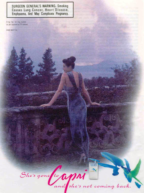1997 ad for Capri cigarettes showing a woman in an evening dress standing at a stone balcony under a cloudy sky, holding a cigarette. Text: "She's gone to Capri and she's not coming back"