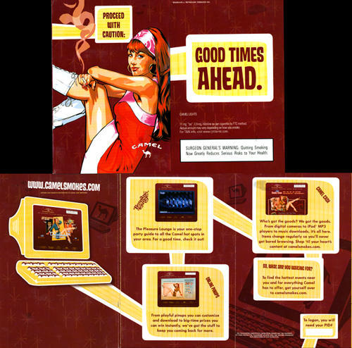 Direct mail from Camel in promotion of the brand's website and it's various features such as the "Pleasure Lounge" (where a user can search for various events in their area), "Online Pinups" (where a user can download pinup images), and "Camel Cash" (where users can view and shop for items with their saved up Camel Cash).