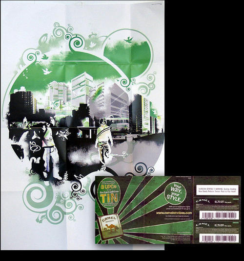 Direct mail from Camel in promotion of a limited edition Camel Menthol tin, redeemable by mailing in three Camel UPCs. Piece also comes with a poster, which makes use of various designs and the menthol marked color of green.