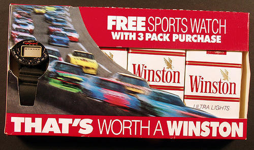 Free Winston Nascar racing wristwatch with the purchase of 3 ultralights. An order form for more packs of merchandise is enclosed inside.