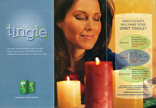 Direct mail from Salem, with a description of various scents that can be used to enhance romance, energy, and relaxation. "Tingle" "Use some common scents to make your spirit tingle. And as you do, enjoy Salem's smooth menthol that is alwasy there to refresh your spirit." "Refreshing natural menthol".