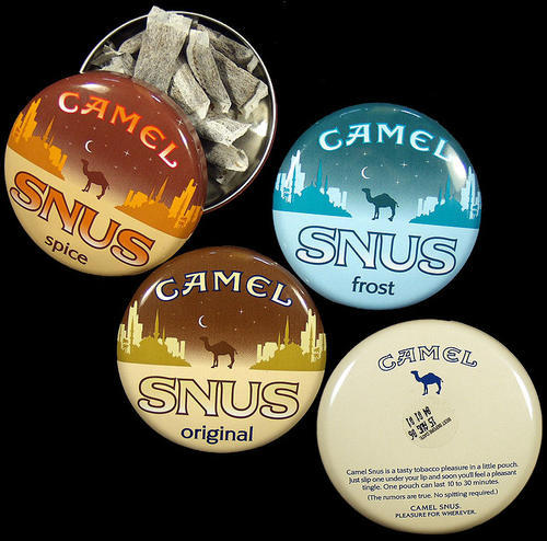RJ Reynolds test packages of new Camel Snus, introduced for test marketing in Portland, OR and Austin, TX in May 2006. Flavors include original, frost and spice.