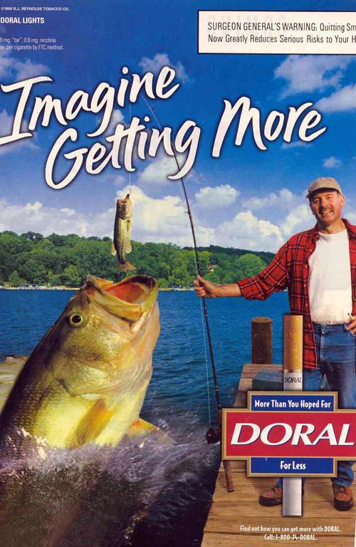 1999 ad for Doral light cigarettes showing a man standing on a pier holding a fishing rod with a small fish on the end of it, and a large fish coming out of the water to eat the smaller fish. Text: "Imagine Getting More" Smaller text: "DORAL -more than you hoped for, for less"