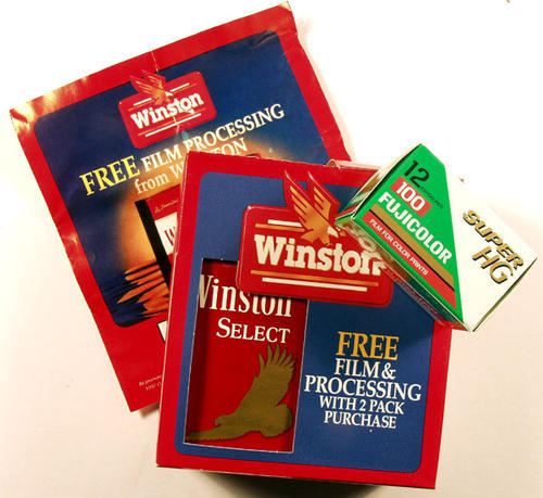Free roll of Fuji film with 2 pack purchase. Also includes free film processing. Red and blue box.