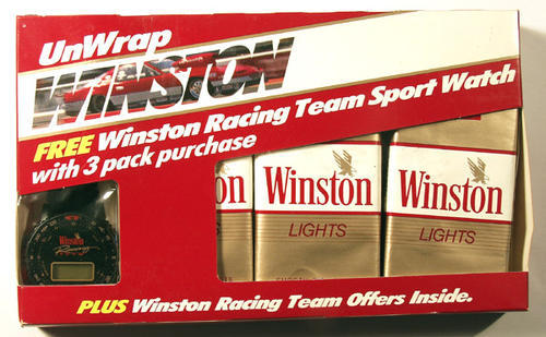 "Unwrap Winston" Free Winston racing team sport watch with 3 pack purchase. Racing Team Offers inside. Red & white box. Lights & Ultra lights 100s. Black, red and gold plastic watch.