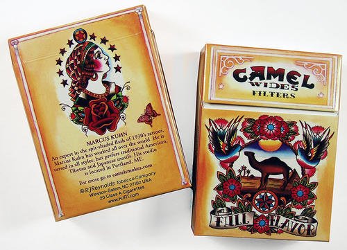Limited edition designer pack of Camel Wides, featuring the tattoo styled art of Marcus Kuhn. This represents one design in a series of tattoo themed Camel Wides packages, promoted in the spring/summer of 2006.
