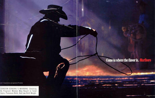 1998 Marlboro showing silhouette of a cowboy sitting a twirling a lasso.