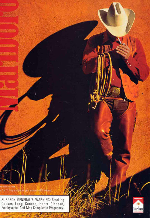 1998 Marlboro ad with image of a cowboy and his shadow leaning against a wall lighting a cigarette.