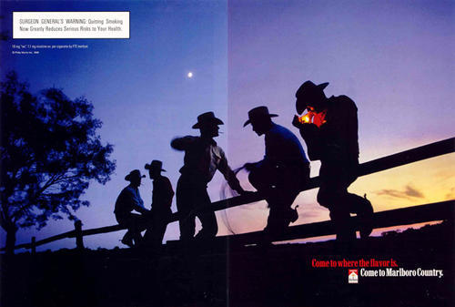 Marlboro ad from 1998, picturing five cowboys taking a break at sunset leaning and sitting on a wooden fence lighting and smoking cigarettes.