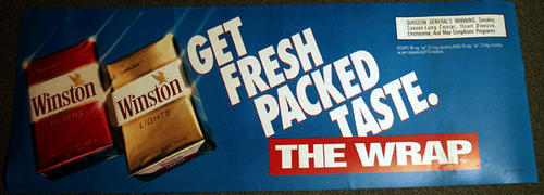 "Get Fresh Packed Taste. The Wrap" on blue background. One Regular filters and one Lights featured. Backlight sign in stone.