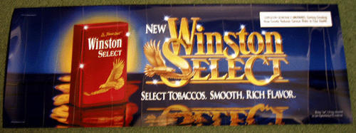Blue Backgroun Poster. "New Winston Select Tobaccos. Smooth, Rich Flavor". in Gold print. Backlight sign in store. Pack shown.