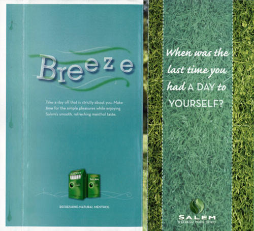 Direct mail from Salem with "tips" on how to enjoy simple pleasures, such as having a picnic with someone special in a park and giving yourself an at-home facial. Comes with 3 cigarette coupons and a survey update postcard.