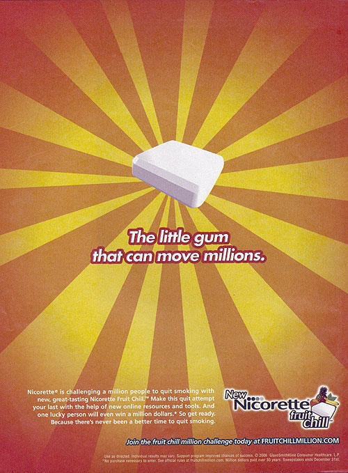 Text: "The little gum that can move millions. Nicorette is challenging a million people to quit smoking with new, great-tasting Nicorette Fruit Chill. Make this quit attempt your last with the help of new online resources and tools. And one lucky person will even win a million dollars. SO get ready. Because there's never been a better time to quit smoking."