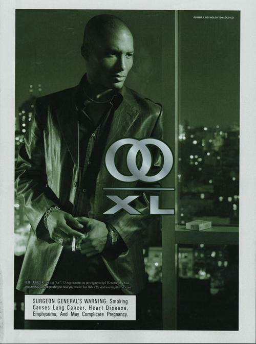 Ad in promotion of Kool's XL wide pack, featuring an image of an African American man dressed in a black suit, leaning against a window and smoking a cigarette.