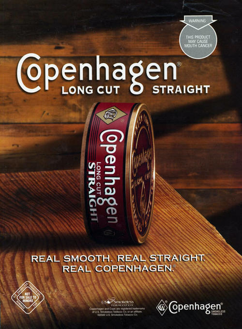 Ad for Copenhagen long cut straight smokeless tobacco featuring an image of the product standing on a wooden table. "Real smooth. Real strength. Real Copenhagen."