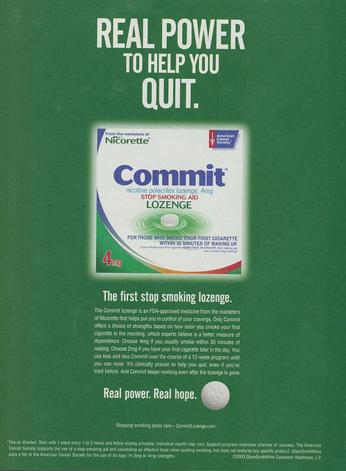 Ad for the Commit Lozenge. Features an image of the pack against a green background. "Real Power to Help You Quit." "The first stop smoking lozenge". "Real power. Real hope."