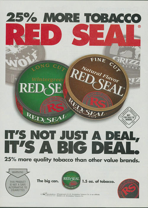 Ad for Red Seal smokeless tobacco in promotion of its value. "25% more Red Seal" "It's not just a deal, it's a big deal. 25% more quality tobacco than other value brands."