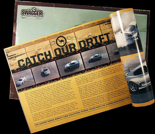 "Swagger" "Walk the Walk". Magazine style booklet featuring stories about bands, musicians, djs, cars and artists. Piece also comes with 2 coupons and a mail in card for friends to use to sign up for direct mail.