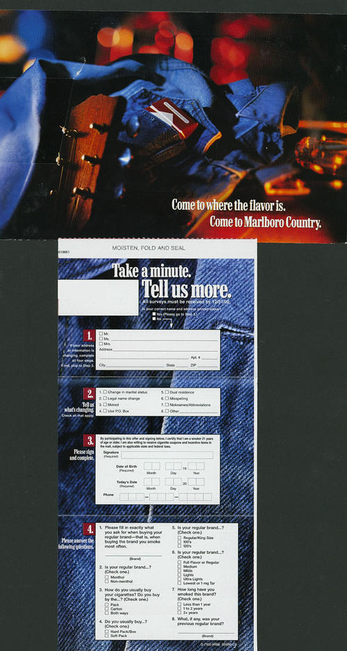 Simple piece of direct mail from Marlboro sent to receiver with a survey requestion more information about the receiver.