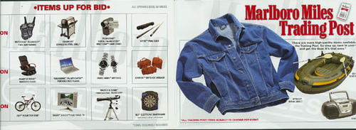 Promotion and invitation to the "Marlboro Miles live auction and trading post", where individuals can bid their saved Miles on items of interest (or alternatively just turn them in for redeemable items). Piece illustrates items up for bid and provides information on the event process and locations.