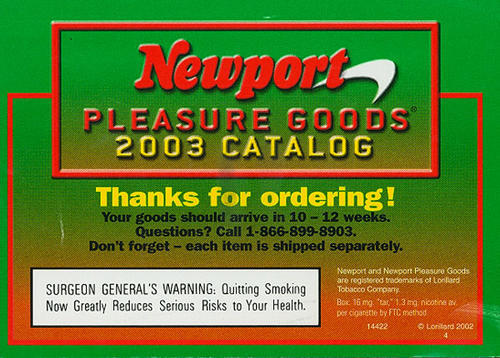 Post card sent from Newport thanking the receiver for ordering the 2003 Pleasure Goods catalog.