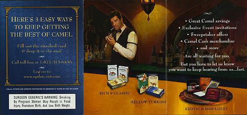 Direct mail requesting the receiver to update their profile information to indicate their continued interest in receiving direct mail. "If we don't hear from you soon, offers will stop coming your way." Piece features an image of a bartender lighting a cigarette, and the three styles of Camel cigarettes: classics, turkish and exotic blends.