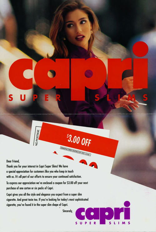 "Thank you" note from Capri for "keeping in touch" with the brand. Includes cigarette coupons as an "expression of appreciation".