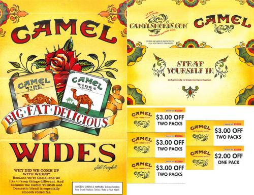 Direct mail from Camel in promotion of the Camel Wides cigarette style. Features the tattoo-style art/design work of artist Scott Campbell. Piece came with 5 coupons, a mail in smoking preferences survey card, and a mail in card to pass on to a friend for signing up for direct mail.