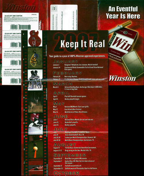 Direct mail from Winston featuring a calendar highlighting sporting related events during 2007. Piece promotes Winston's website and also includes 4 cigarette carton coupons.