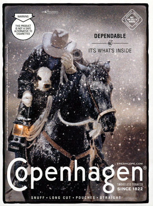 Ad from Copenhagen, featuring an image of a cowboy on horse, holding a small calf, during a snow fall. Slogan: "It's What's Inside"