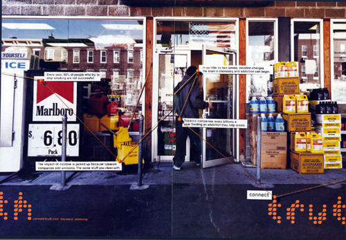 Two page ad from the Truth campaign (sponsored by the American Legacy Foundation). Image of a retail storefront, with text boxes of tobacco related facts.