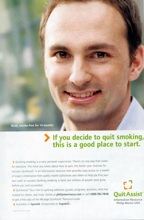Ad from Philip Morris' Quit Assist program. Features close up of an individual who has quit smoking: "Brad, smoke-free for 14 months."