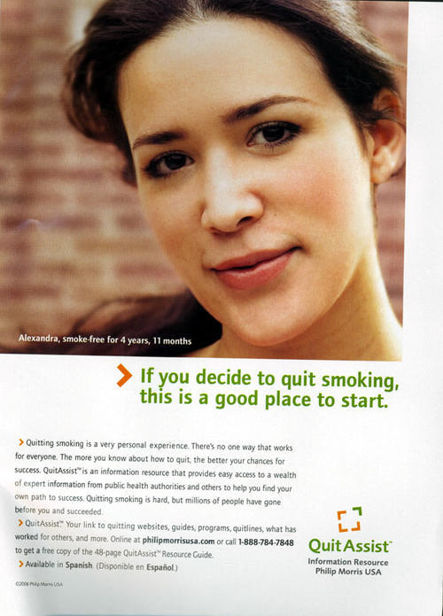 Ad from Philip Morris' Quit Assist program. Features close up of an individual who has quit smoking: "Alexandra, smoke-free for 4 years, 11 months."
