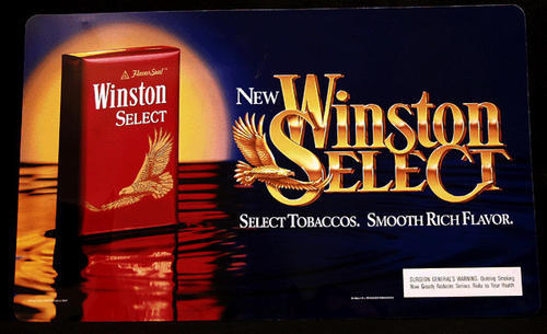 Countertop pad. "New Winston Select. Select tobaccos. Smooth rich flavor. Blue with an Image of Select.