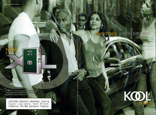Two page ad in promotion of Kool XL wide pack. Features an image of a couple leaning against a car in what appears to be a city street. Couple is well dressed and man can be seen holding a lit cigarette.