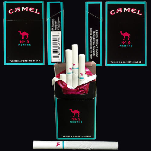 Pack of Camel No. 9 menthol cigarettes, introduced in February 2007 and directed at female audiences. Package is black with teal and hot pink (or magenta) coloring (borders, lettering, Camel logo). Cigarettes are white with same pink colored Camel logo and teal coloring on filter.