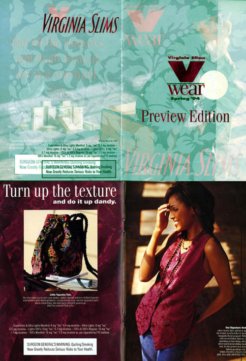 1994 Virginia Slims V Wear Catalog sent by direct mail, including items available for redemption with collected pack UPC codes. Catalog order form included. Direct mail piece also came with 4 cigarette coupons.