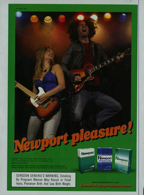 Newport ad featuring an image of a man and a woman smiling and laughing while playing guitar on stage.