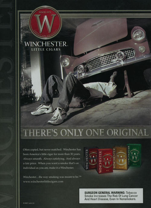 Ad for Winchester little cigars featuring an image of a man working on a car. Text: "There's only one original. Often copied, but never matched. Winchester has been America's little cigar for more than 30 years. Always smooth. Always satisfying. And always a fair price. When you want a smoke that's as individual as you are, make it a Winchester. Winchester...the way smoking was meant to be."