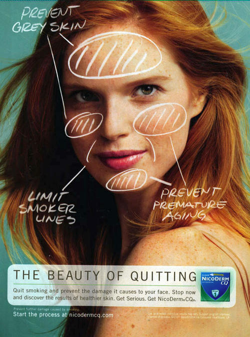 Ad for Nicoderm nicotine patches. Features an image of a woman with drawn circles on her face pointing out what the benefits of quitting smoking would be (ie, "prevent grey skin", "limit smoker lines", "prevent premature aging"). Ad text: "The beauty of quitting. Quit smoking and prevent the damage it causes to your face. Stop now and discover the results of healthier skin. Get serious. Get NicoDerm CQ."