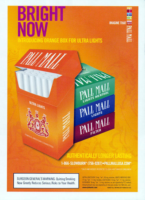 Ad for the introduction of Pall Mall Ultra Lights in a brightly colored orange package. Ad features an image of the pack, along with Pall Mall's other blends, against an orange colored background. In 2007, RJ Reynolds designated Pall Mall as one of the company's "growth brands".