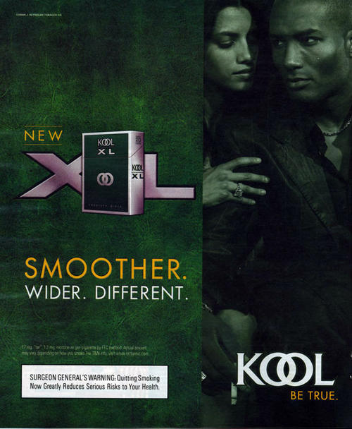 Advertisement for Kool's XL wide pack, featuring a partial image of a young African American man dressed in a suit and smoking a cigarette with a woman closely leaning over his shoulder.