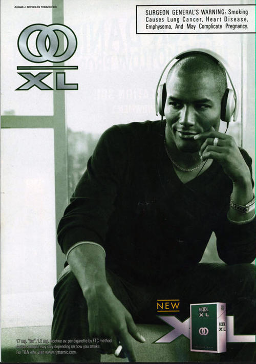 Advertisement for Kool's XL wide pack, featuring an image of a young African American man, sitting and smoking a cigarette with a set of headphones on.